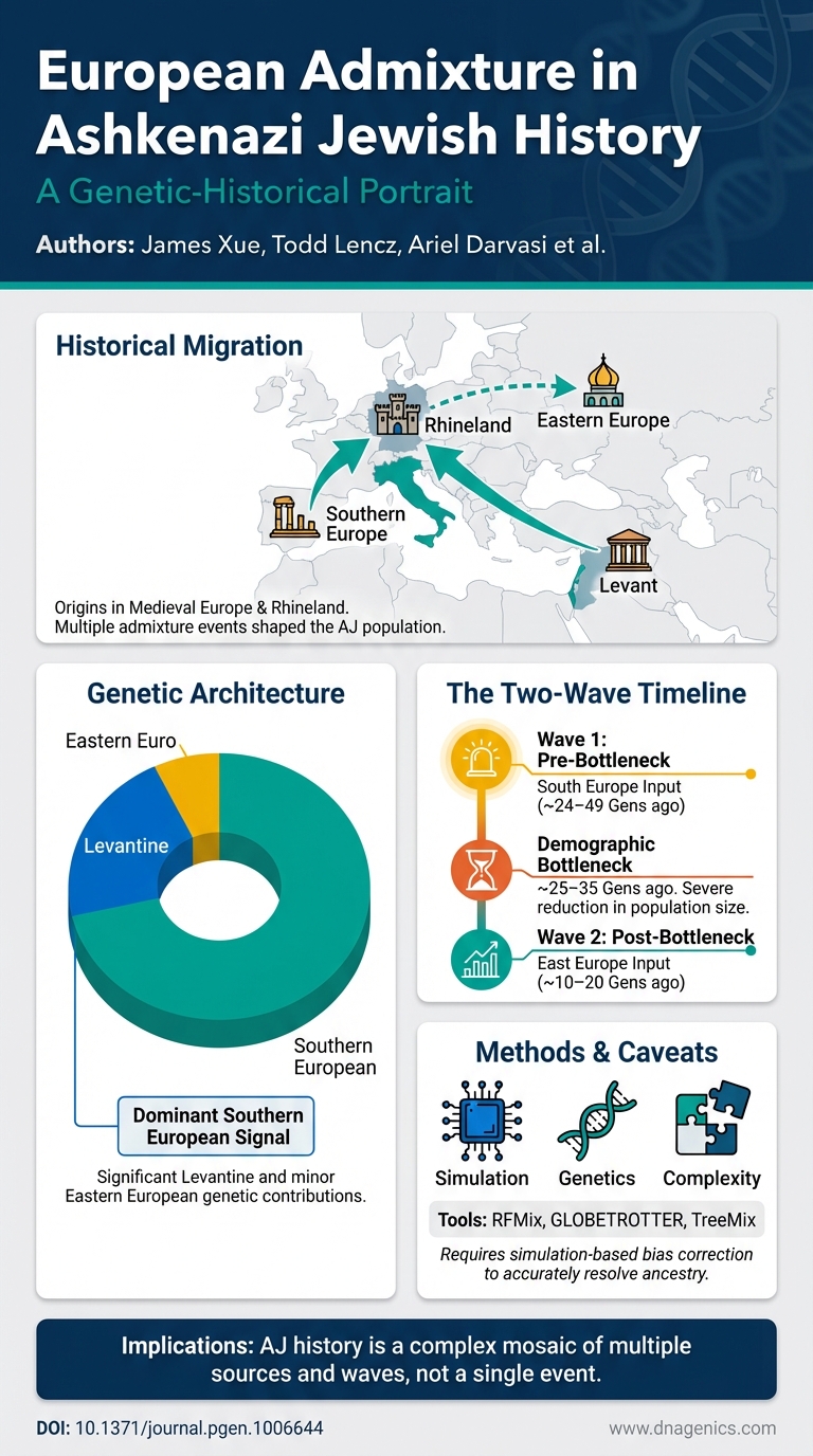 The Ashkenazi Jewish (AJ) population is a genetic isolate close to European and Middle Eastern groups, with genetic diversity patterns conducive to disease mapping. Previous studies have suggested that the population originated from a small number of founders in the Middle Ages, but their geographic origins are still debated.