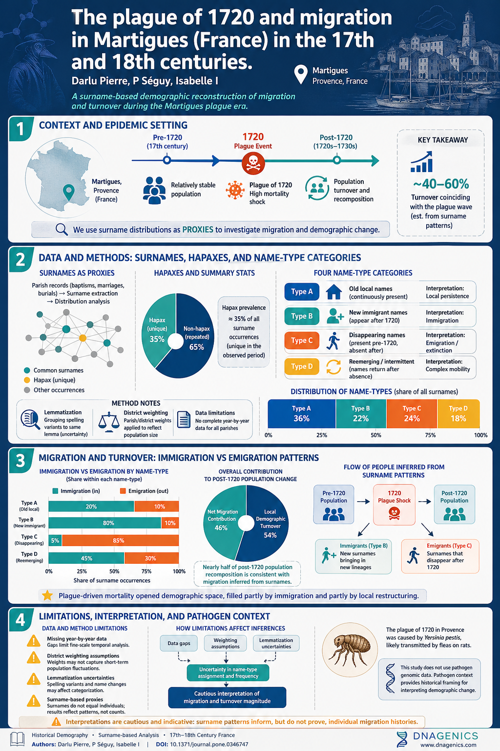 One-off events such as wars or epidemics can change the structure of populations, by encouraging the mobility or causing the death of certain categories of people. They can also lead to a demographic slump, made up for by the arrival of new migrants. The town of Martigues (Bouches-du-Rhône, France) provides an example of this kind of local population renewal. Between the seventeenth and eighteenth centuries, its population was partially renewed after the plague of 1720. To measure the effect of the plague as a disruptive event, data on the surnames of people born in Martigues before and after the epidemic of 1720 were collected and analysed. After a delicate stage of lemmatization of the surnames, three categories of names were distinguished: those present before 1720 and which disappeared from Martigues after the plague; those absent before 1720 and which appeared afterwards; and surnames that were continually present in Martigues, but whose frequency in terms of the number of births per year could be contrasted between before and after 1720. The surname data for these three categories is compared with the list of names of the victims of the plague, which makes it possible to envisage a possible reason for their disappearance. In addition, the frequencies of surnames in the 18th century in the Bouches-du-Rhône department and in France in the 19th century make it possible to locate the possible destination of people whose surnames disappeared after 1720, as well as the probable origin of the surnames of people arriving after 1720. This study helps us to understand how the impact of an epidemic crisis can affect the evolution of a population on a local scale. The surname method used here indicates that the plague caused an exceptionally large renewal of approximately 50% of the stock of surnames, and thus of the population bearing those names. It also shows that fertility declined significantly among individuals whose surnames were already present among those who died of the plague. Finally, the results demonstrate that population renewal was achieved primarily through immigration, mainly from neighbouring municipalities.